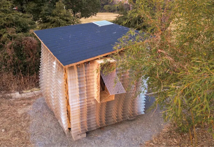 Shaped by both its natural environment and experimental design, the cabin features a translucent acrylic skin that filters soft, ambient light into the space, enhancing the contemplative mood ideal for tea rituals. Inside, a timber frame—optimized through AI-driven design using GAN algorithms—gives structural clarity while adding sculptural elegance. Carefully placed openings create a dialogue with the landscape: a welcoming front door connects to a nearby path, and a large bay window on the south side frames the surrounding bamboo grove like a living painting.