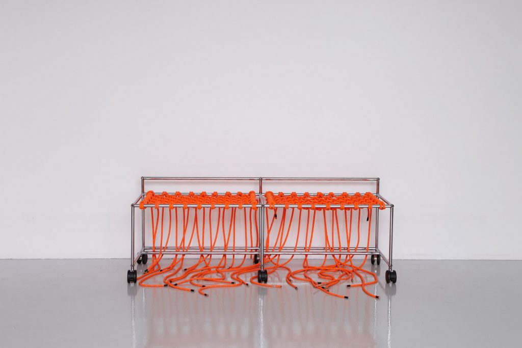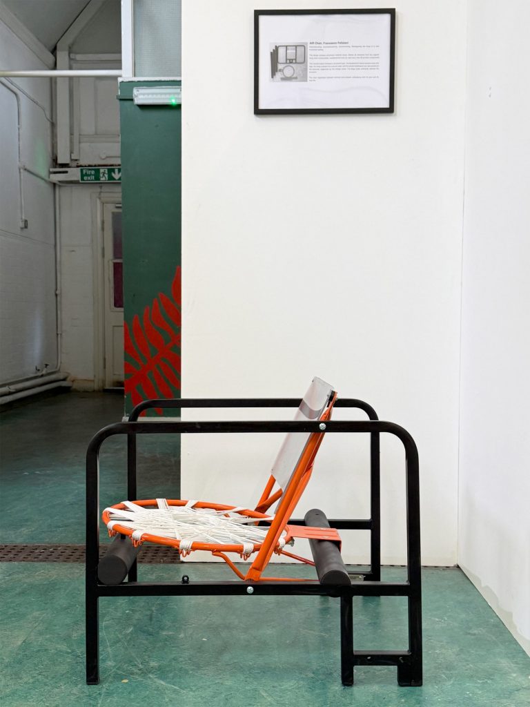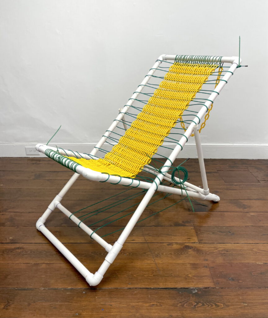 Further pushing the concept is Tensioned Tarp Semi-Sling Seat (Beware of Dog) by we are happy people inc, where chain link fence gates and a stretched tarp form an unexpectedly inviting chair. Meanwhile, Jed Heuer’s Trophy (for walking through a door), constructed from a bent aluminum doorway threshold and a beam clamp, adds sculptural whimsy to functional lighting.