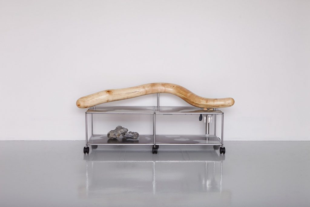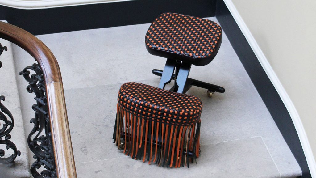 This ethos runs through all the works in Unbroken. 2LG Studio’s Resistance Chair repurposes resistance bands—materials intimately tied to co-founder Russell Whitehead’s injury recovery journey. Once tools of physical rehabilitation, the red bands now lace a once-worn chair in dramatic ruffles, turning pain and healing into an unexpectedly vibrant statement. Elsewhere, industrial designer Sebastian Bergne takes a more irreverent approach with the Trauma Table, made from a disassembled wooden rocking horse. The animal’s parts—legs, head, rockers—are rebuilt into a functional table, a tongue-in-cheek meditation on memory and transformation.