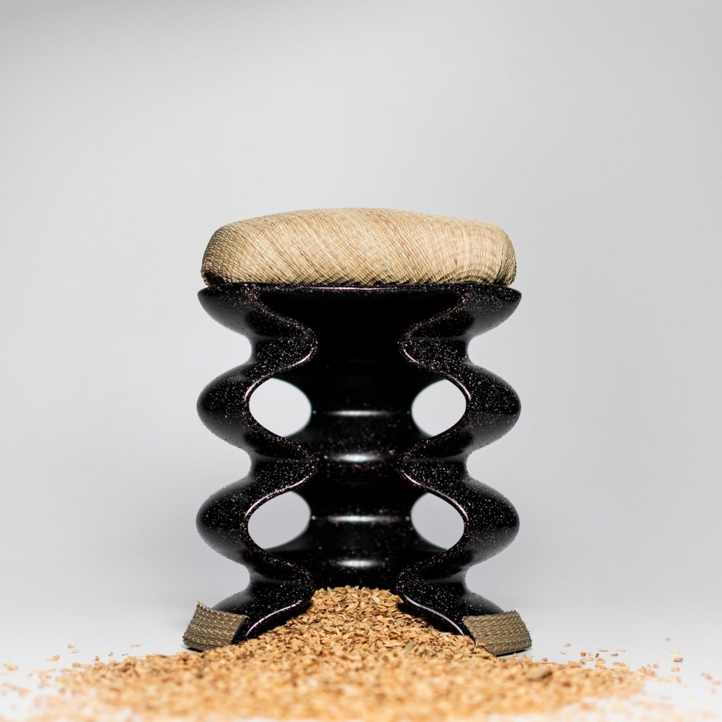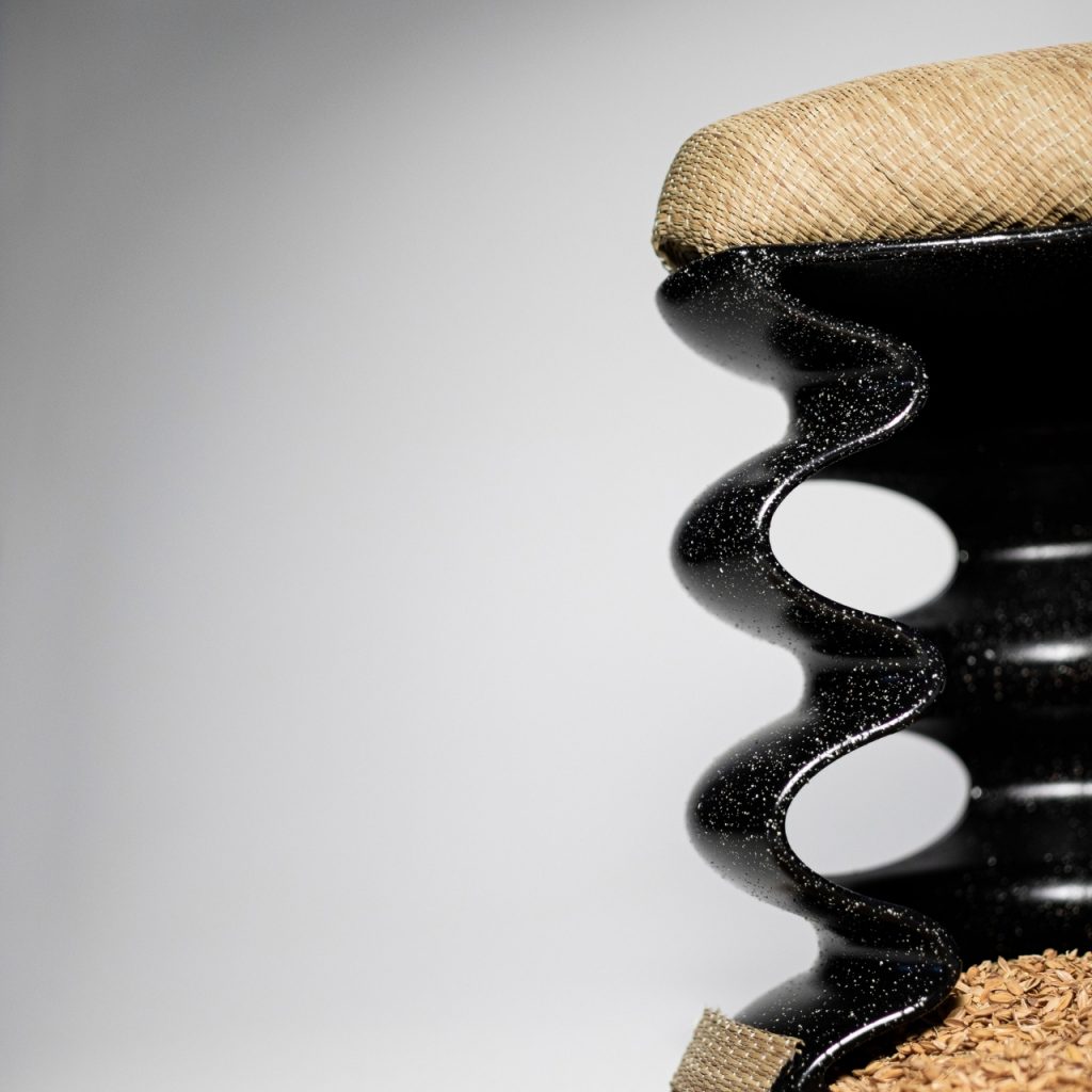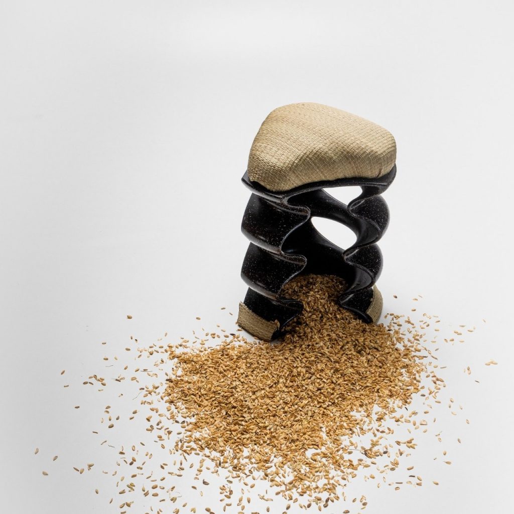 His process involves combining rice husk and carbon, breaking them down, and molding them into a sculptural stool through perfusion molding. The result is an elegant round form that captures what Wu calls a “harmonious emotion” between material and human.