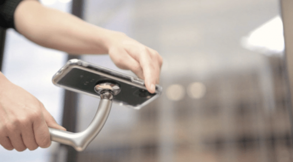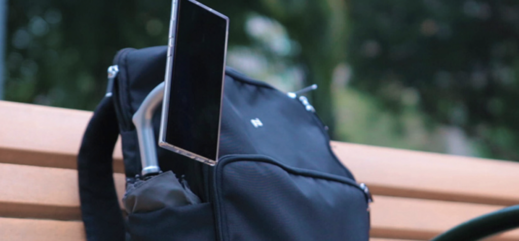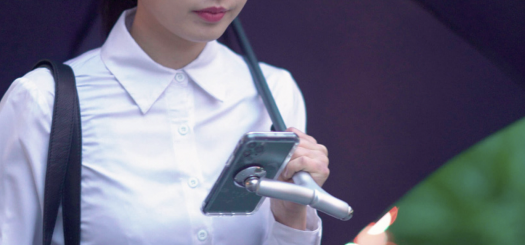 As a transition from illumination to interaction, our next design pushes everyday usability even further by blending rain protection with digital habits. For anyone who has ever tried to balance an umbrella in one hand and a smartphone in the other, the Sumaho Kasa presents a remarkably intuitive solution. This Japanese design incorporates a magnetic phone holder at the handle, allowing users to mount their device securely and free their hands while walking in the rain.