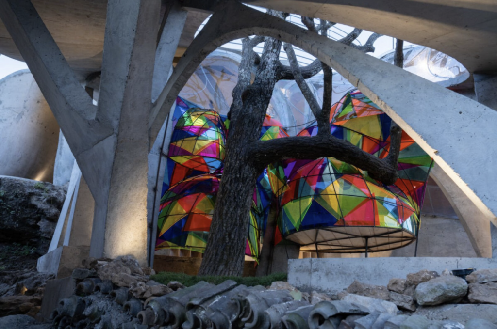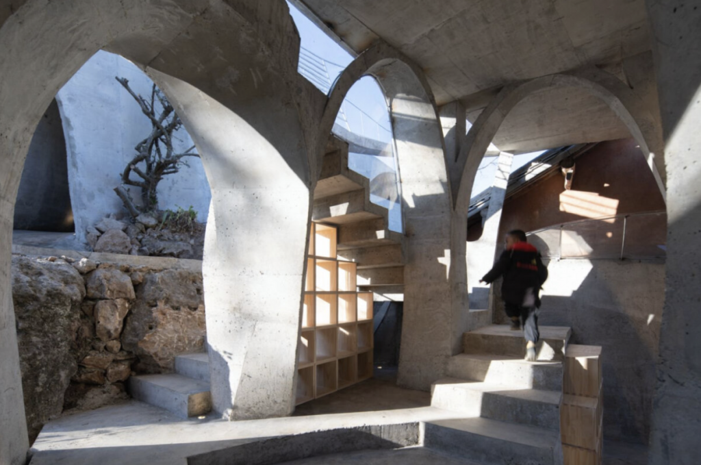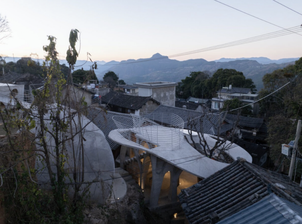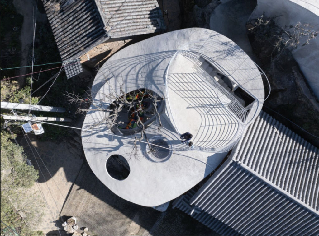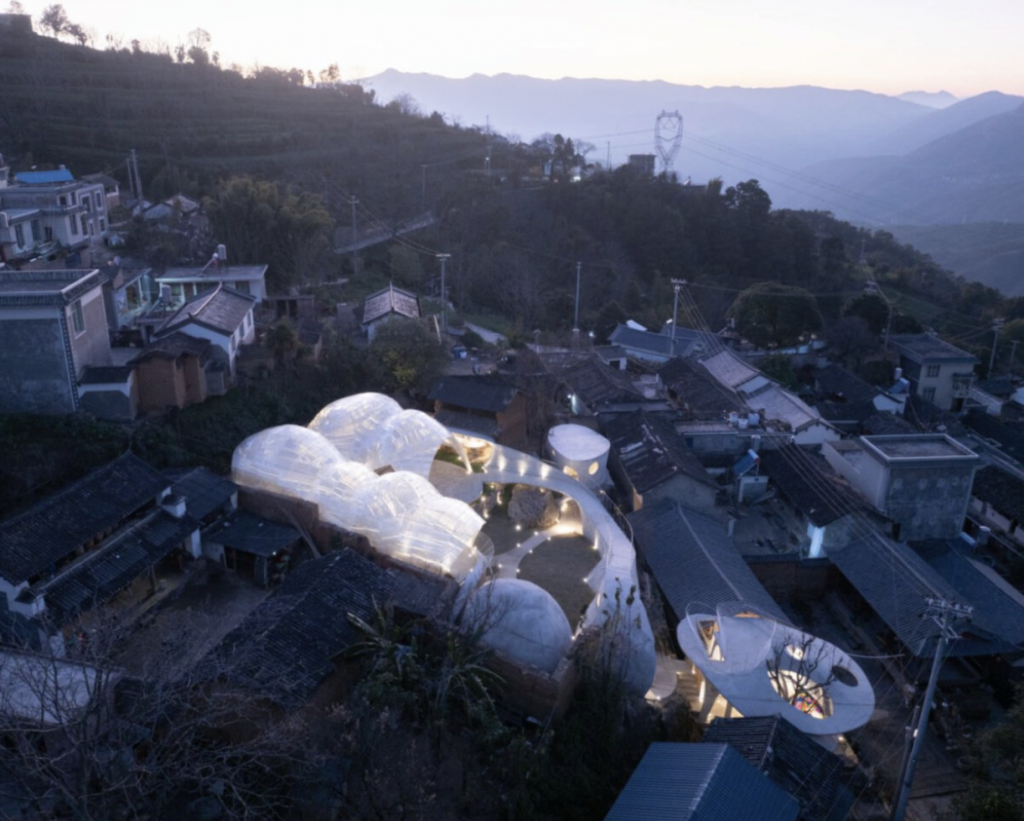 In the remote rural landscape of Yunnan, China, Kong Xiangwei Studio’s Mushroom Library for Children creates a playful and adaptive reading environment. Nestled between traditional dwellings and shaded by an ancient raisin tree, the library responds to both spatial constraints and the desire to preserve local heritage. A lightweight steel framework forms branching arches that support cast-in-place concrete vaults, capped with a mushroom-shaped roof. The structure changes depending on perspective: a simple brim from the alley, an ethereal glowing form from above, or an almost animate presence at night.