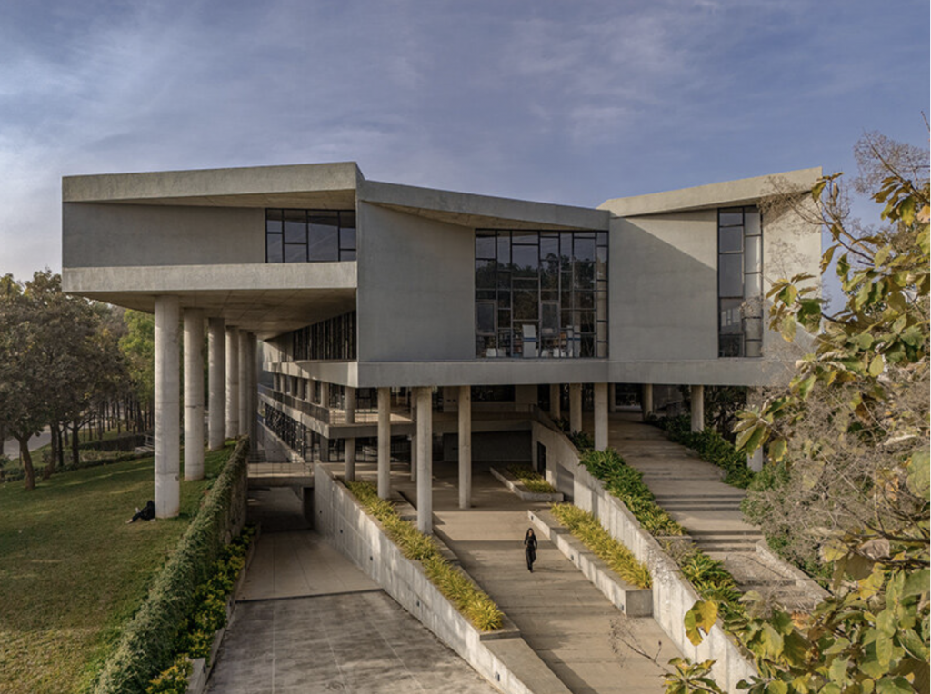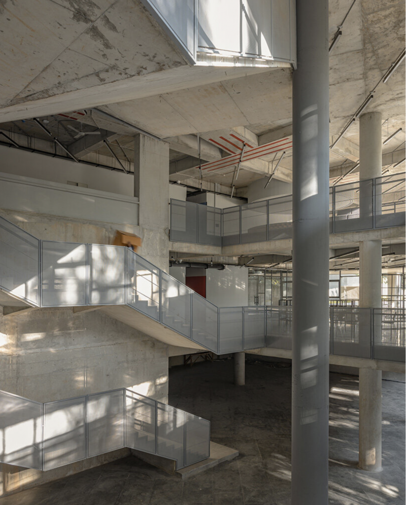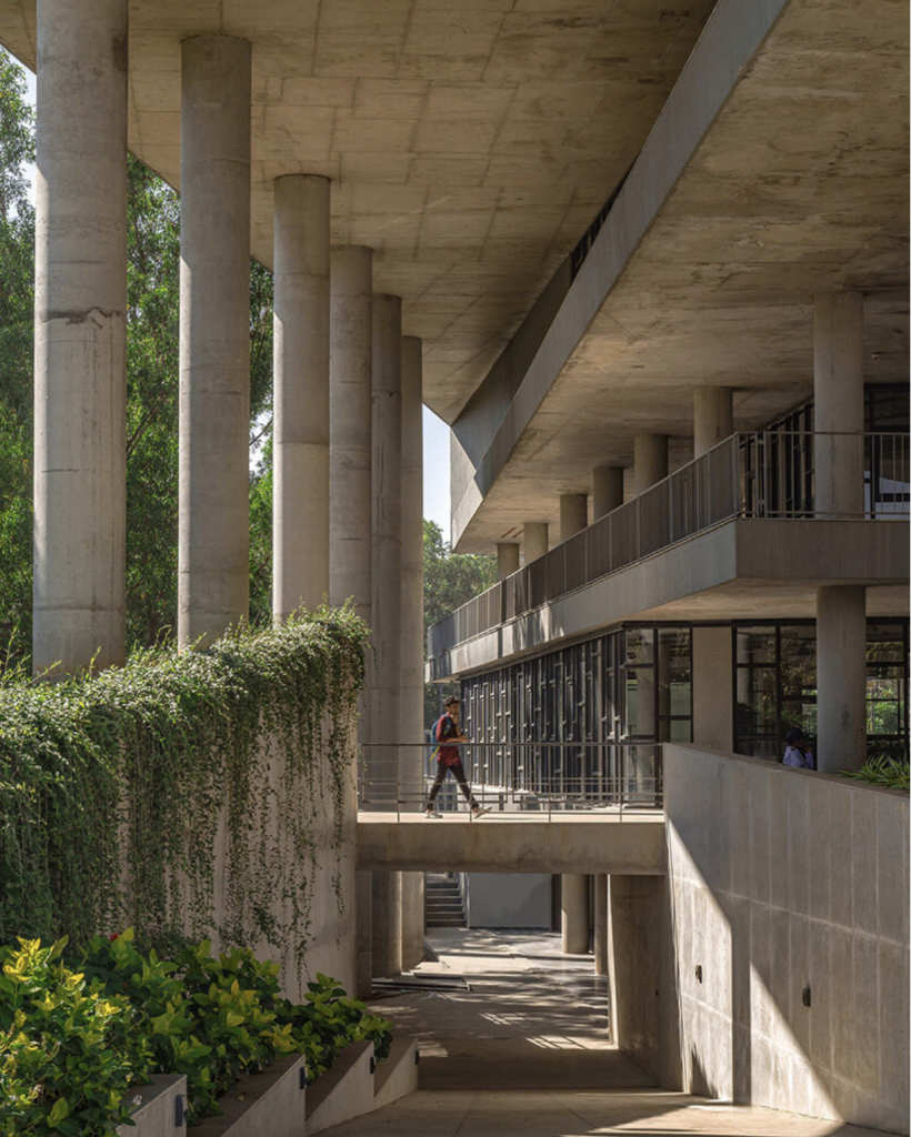 Elevated atop pilotis, the building integrates with the surrounding campus and preserves existing trees while allowing pedestrian movement beneath. Its exposed concrete mass conveys strength and permanence, yet broad pathways and open circulation invite interaction, positioning the library as both destination and connector within the university’s masterplan.