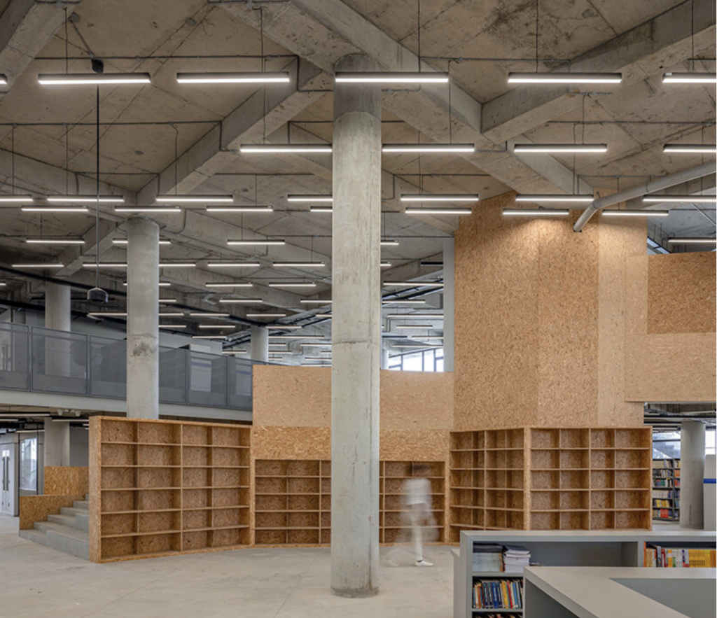 The interior balances privacy and collaboration through sectional complexity. Intimate reading alcoves coexist with large communal zones, while generous openings provide natural light and ventilation. The interplay between solid and porous volumes ensures the library feels grounded yet welcoming, supporting both focused study and spontaneous social engagement. This combination of openness, materiality, and thoughtful circulation creates a democratic space where learning and interaction are equally valued.