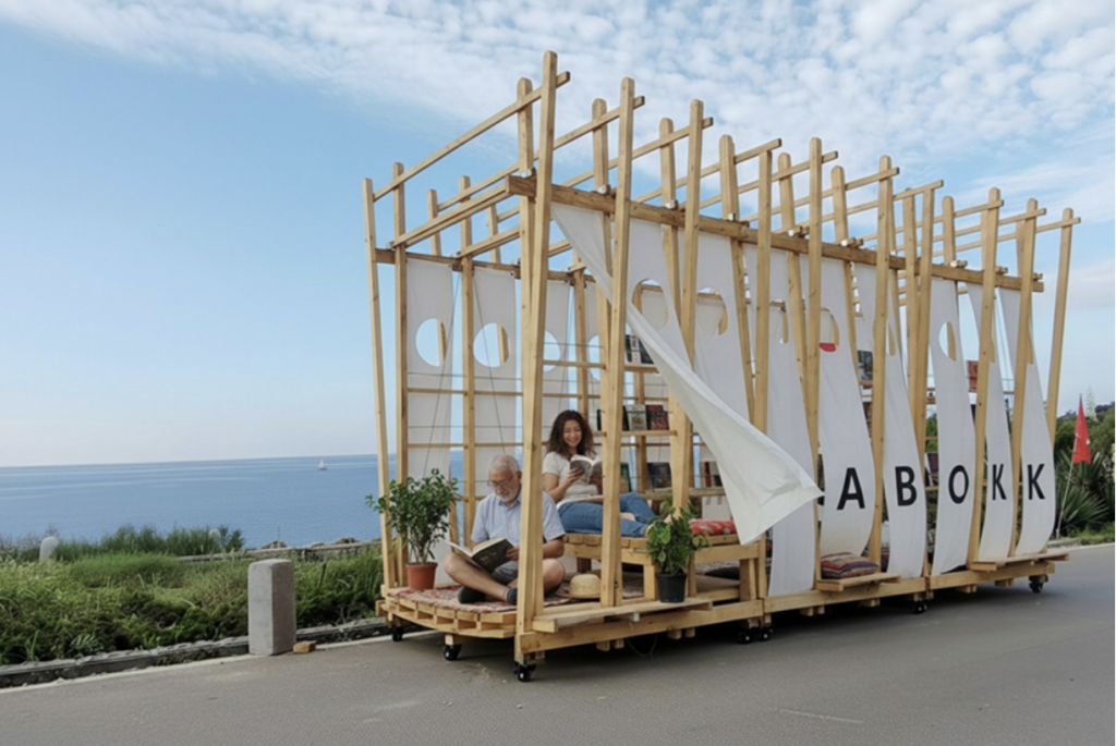 Large openings frame sea views and allow natural ventilation, while outdoor terraces expand opportunities for reading, learning, and social gathering. Timber’s natural tones integrate the structure into its coastal context, creating a flexible space that accommodates seasonal and community needs. Beyond its primary function as a library, the mobile design serves as a cultural platform, hosting performances and educational activities, exemplifying how architecture can become both socially catalytic and portable.