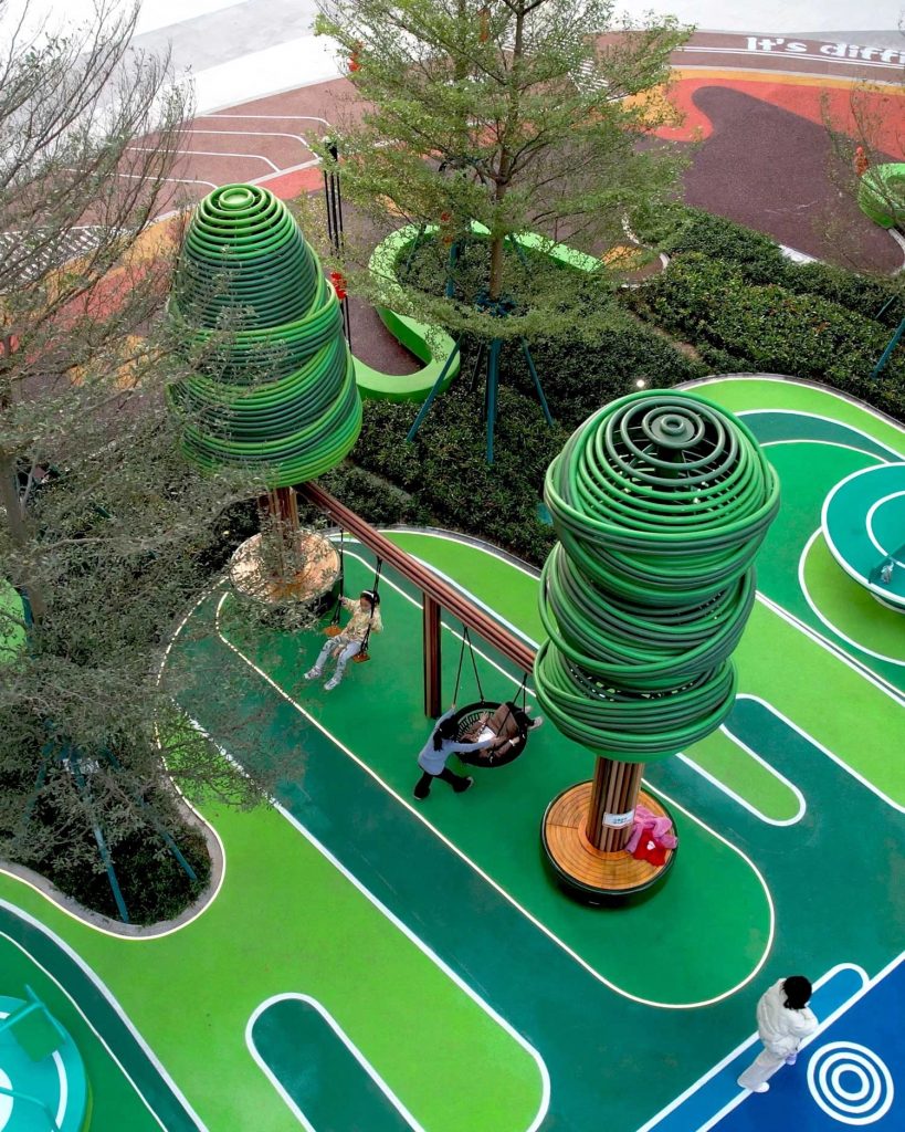Set within a residential district in Guangzhou, Wired Scape by 100architects reimagines the neighborhood playground as an abstracted natural landscape. Rather than replicating trees and rivers literally, the design translates forest and flowing water into sculptural geometries and graphic surfaces. The result is a fluid environment that feels organic while remaining unmistakably urban, where movement and discovery are embedded into the ground plane itself.