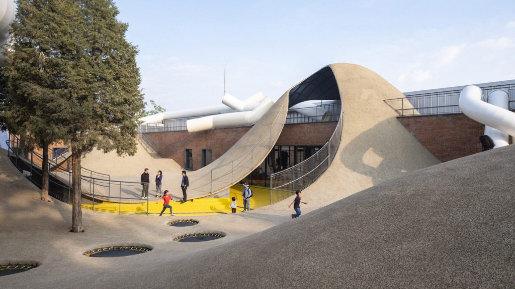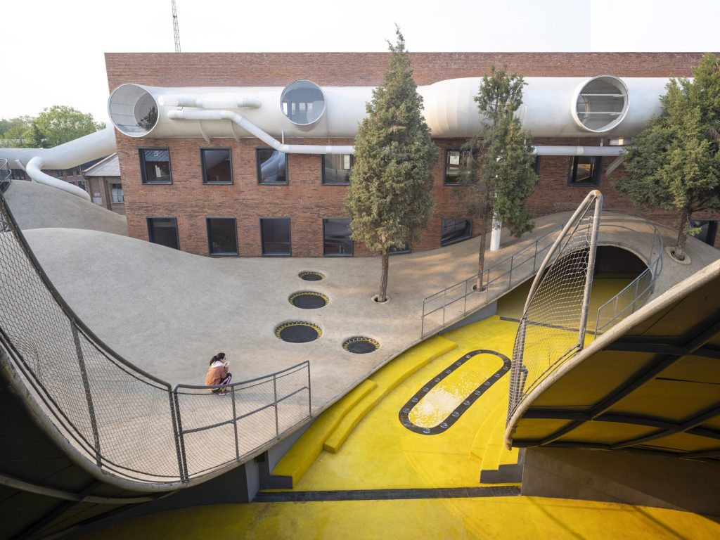 If Wired Scape abstracts nature into geometry, waa’s Playscape in Beijing looks inward, transforming an industrial relic into a tool for sensory learning. The project converts a cluster of 1970s warehouses into an experiential community center for children, organized around a central courtyard and connected by roof terraces and an aerial bridge. What was once a closed industrial compound is now an open, looping environment of exploration.