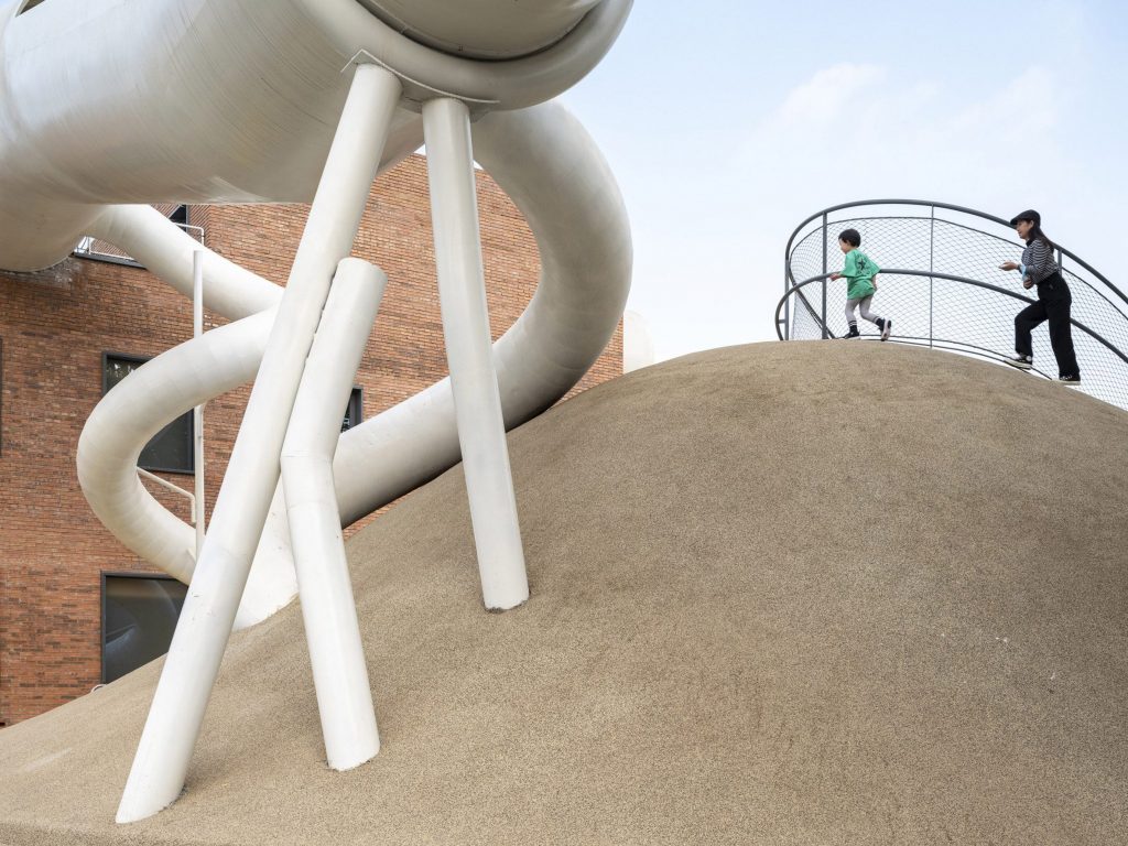 The mound itself is a landscape of hills and hidden spaces, inviting free exploration above and sheltered play below. Throughout the complex, age-specific zones range from soft topographies for babies to steep climbing areas with suspended nets. Parents remain part of the experience, circulating along looped roof terraces that also host adult amenities. By embracing risk, distorted scale, and open-ended movement, waa positions play as a formative, empowering act rather than a scripted activity.