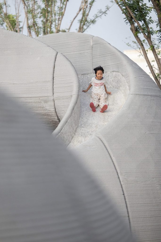According to Xisui Design, 3D-printed concrete offers durability, cost efficiency, and formal freedom, making it particularly suited to outdoor playscapes. Winding paths connect the boulder playground to a water park on one side and a forest zone on the other, encouraging varied rhythms of play. Here, technology quietly recedes into the background, enabling an environment that feels instinctive, exploratory, and grounded in physical experience.