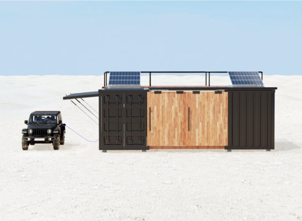 Sustainability plays an important role in the concept as well. Solar panels mounted on the roof generate electricity for the home and can even charge Jeep vehicles parked nearby. Recyclable wood finishes soften the industrial steel frame, helping the structure feel more like a contemporary cabin than a temporary shelter. The result is a hybrid between architecture and outdoor lifestyle equipment, offering a retreat that can exist equally in forests, deserts, or snowy mountains.