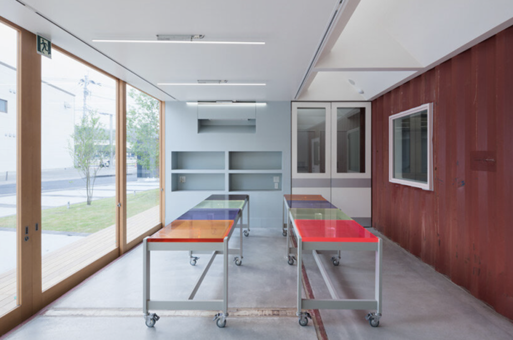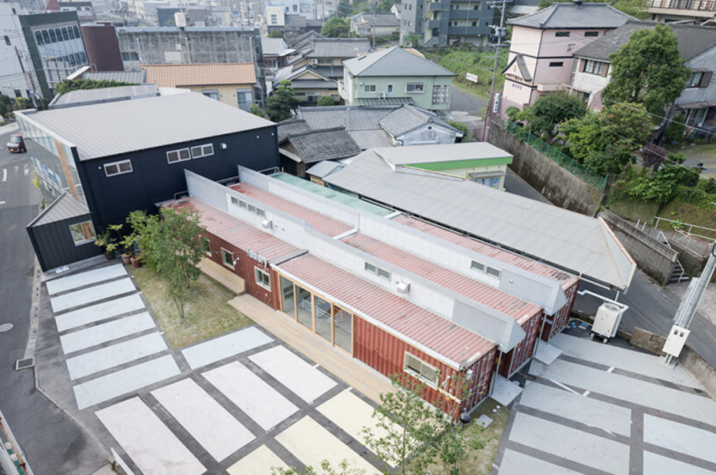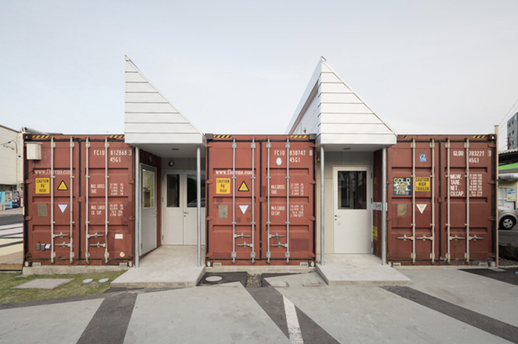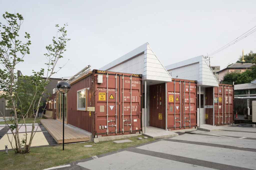 While the first two projects reinterpret containers for leisure and living, the Kotobuki Cheese & Meat Factory in Kagoshima, Japan demonstrates their potential in industrial architecture. Designed by Hyogo-based architecture firm micelle ltd., the building occupies the former site of a demolished department store parking lot. Instead of constructing a conventional factory, the architects assembled the structure from second-hand shipping containers, creating a bold visual contrast within the surrounding rural landscape.