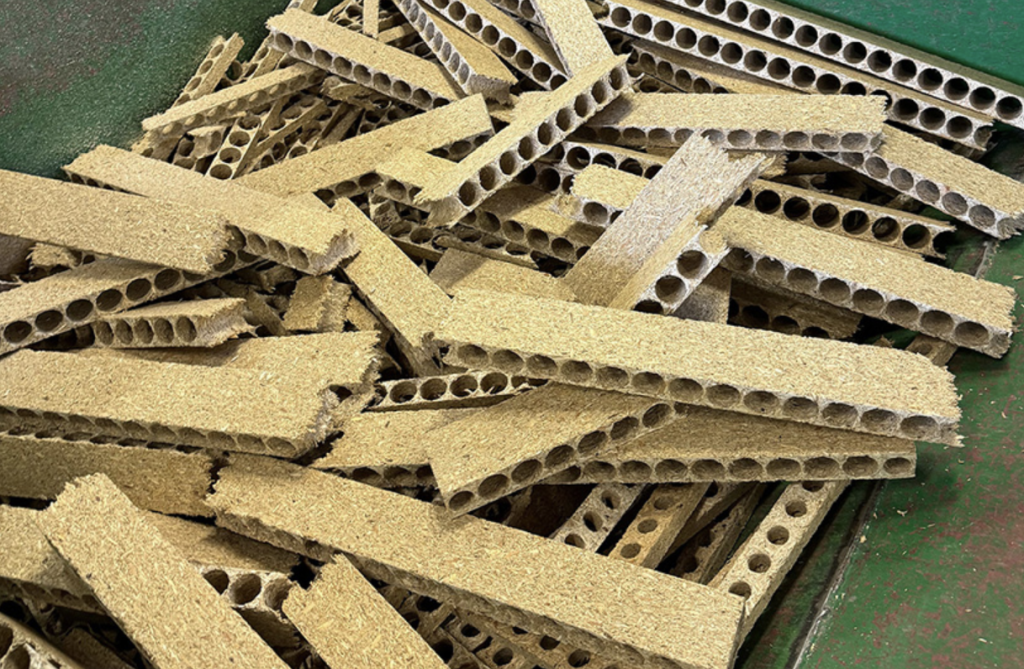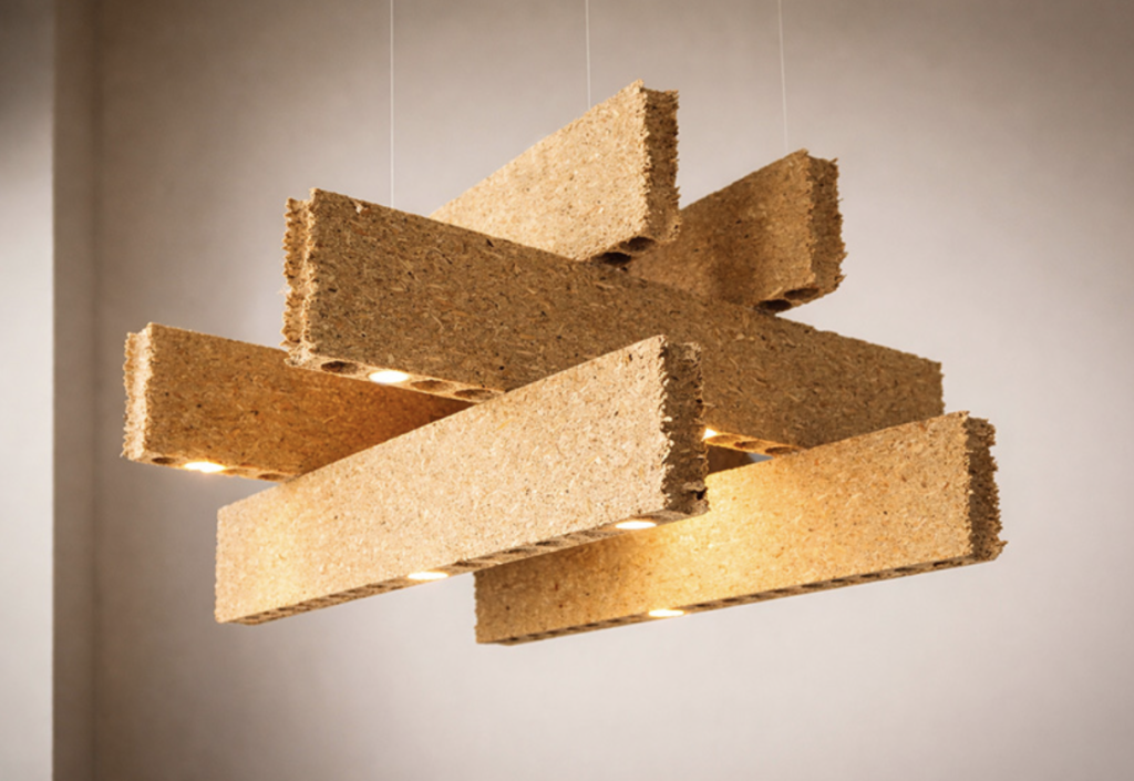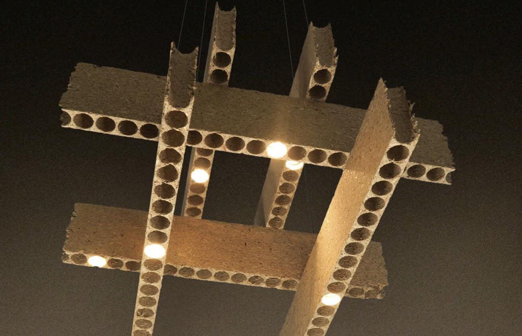 The lamp is built from hollow core door waste, specifically the particleboard panels left over after circular cutouts are made during door production. These openings are typically introduced to reduce weight and accommodate hardware such as handles. Once removed, the perforated boards are usually discarded, leaving behind a material defined by an unexpected pattern of circular voids.
