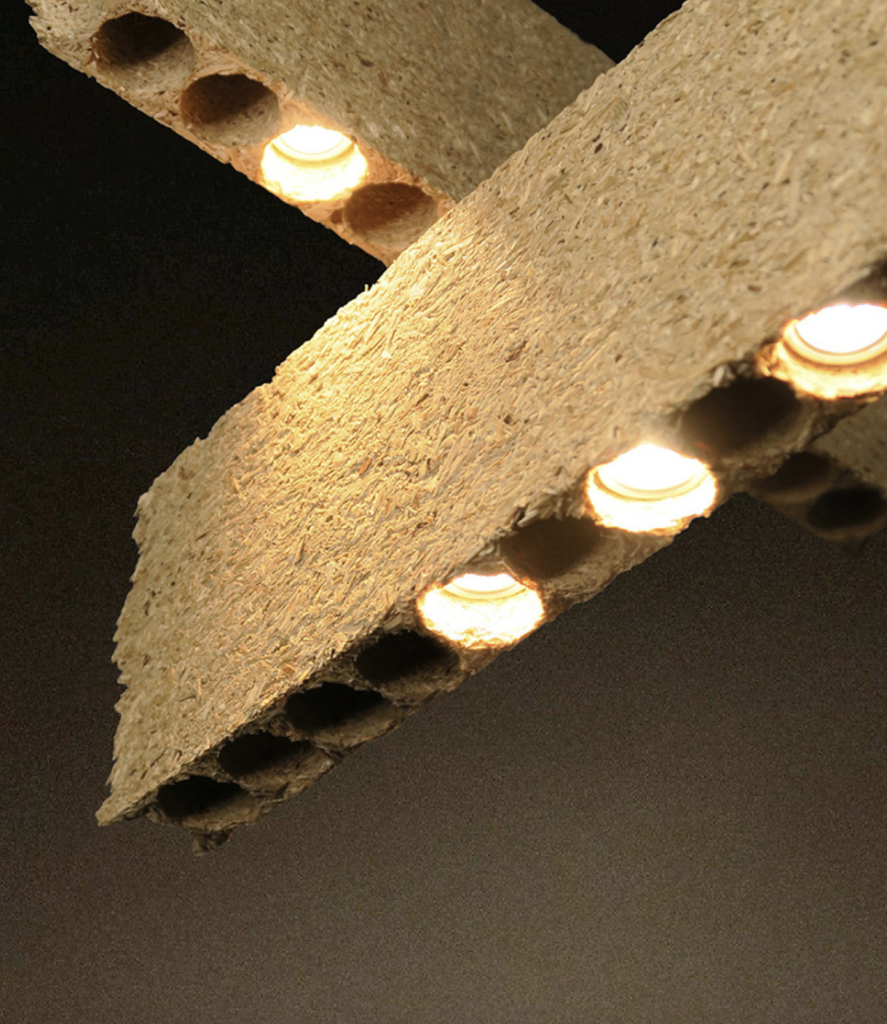 Instead of hiding this industrial byproduct, the designers made it the central visual element of the object. The lamp retains the perforated boards as its structural framework, allowing the repeating circular openings to define its geometry. Potlights are installed directly within the existing holes so that each void becomes a light aperture, transforming negative space into a source of illumination.