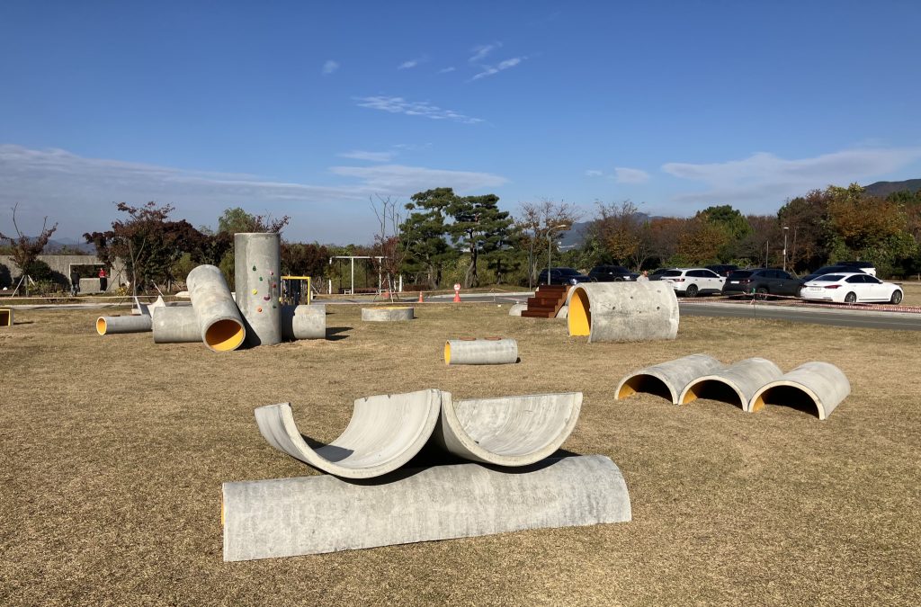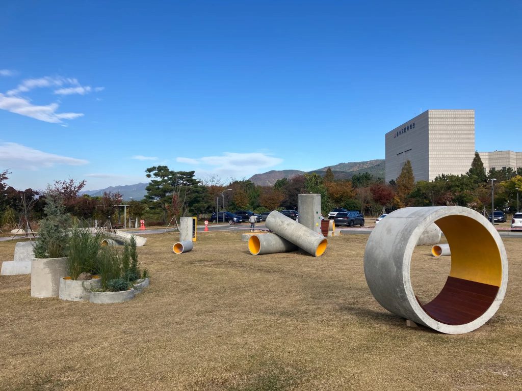 If the Kulhad Pavilion reclaims small everyday objects, Concrete Utopia tackles a material at the opposite end of the scale. Created by designer Hyunje Joo for the Museum of Contemporary Art Busan in South Korea, the installation repurposes discarded concrete pipes into a flexible public pavilion that doubles as an urban playground.