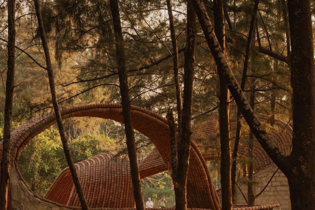 Structurally, the pavilion relies on three compressive catenary vaults, a form that channels forces downward through pure geometry rather than steel reinforcement. The earthen cups are stacked and bonded together to form porous masonry walls that filter light and airflow while maintaining structural stability. This approach highlights how traditional materials and simple physics can produce resilient architecture without relying on resource intensive systems.