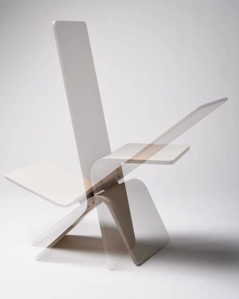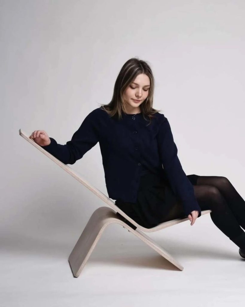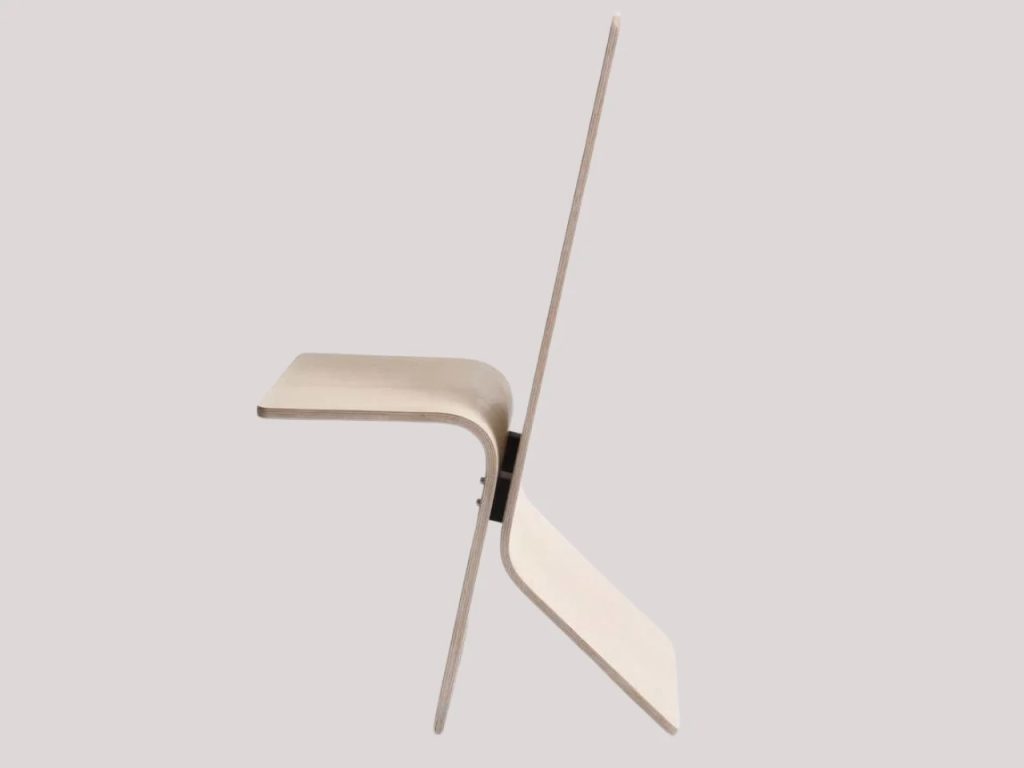 Built from bent plywood, the chair shifts between two positions with a simple movement. In one position it functions as an upright chair. With a gentle forward tilt, it becomes a relaxed lounger. There are no mechanical parts, switches, or complicated mechanisms involved. The transformation relies entirely on balance and the inherent properties of the material.